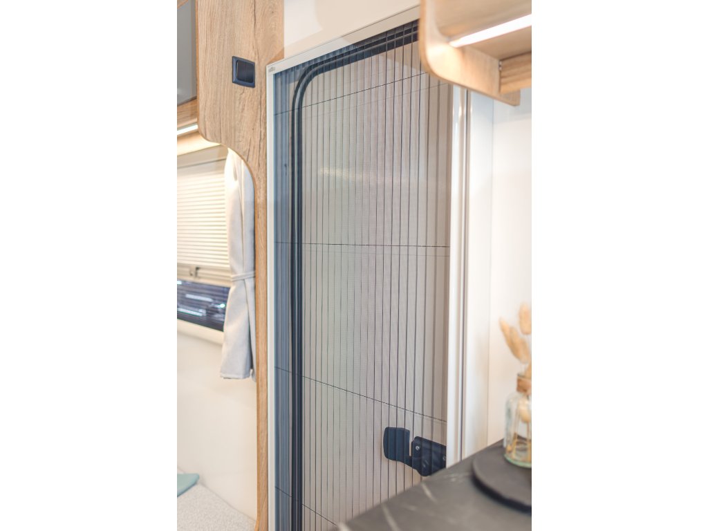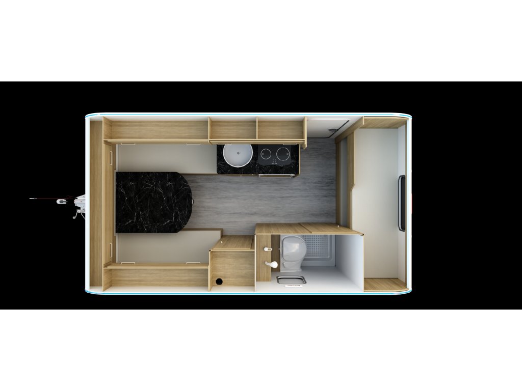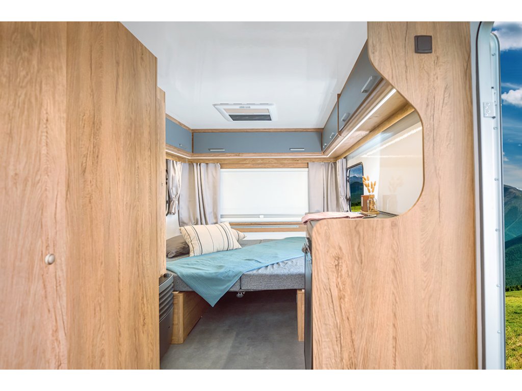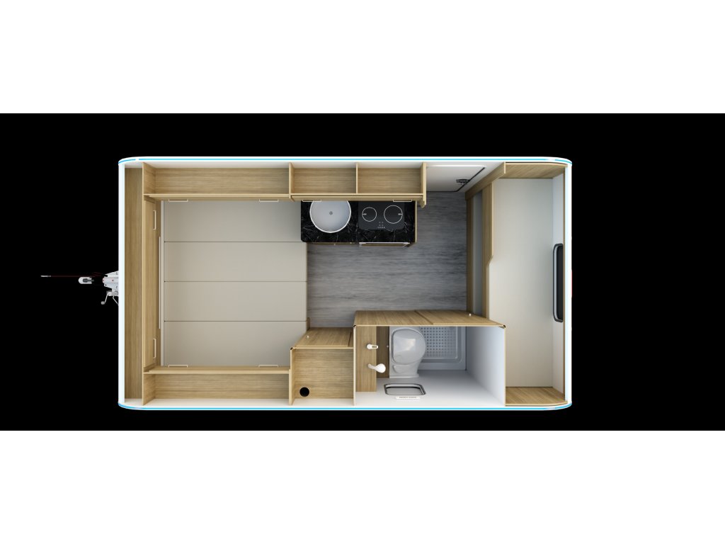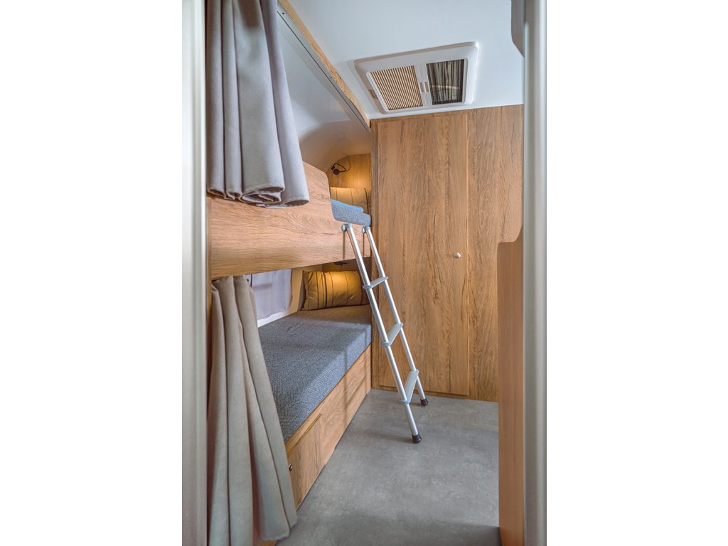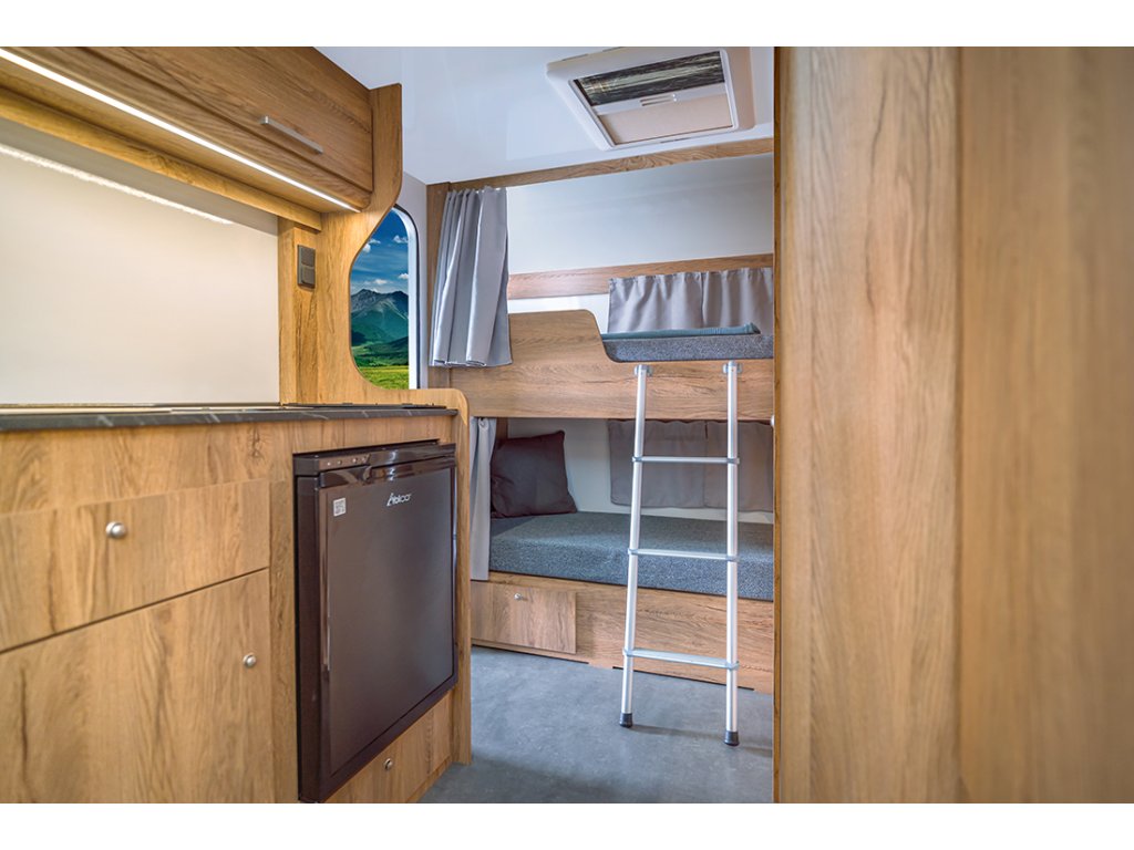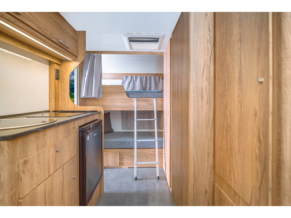 V obývacej izbe je funkčný stôl, ktorý sa dá ľahko premeniť na pohodlnú manželskú posteľ. V zadnej časti prívesu sú poschodové postele - praktické a pohodlné riešenie najmä pre deti. Horné lôžko má maximálne zaťaženie až 70 kg, čo zaisťuje bezpečnosť a trvanlivosť konštrukcie. Pre zvýšené súkromie a pohodlie bol celý priestor na spanie oddelený závesmi, ktoré vytvárajú útulnú, intímnu zónu odpočinku. Vysoký komfort používania je zabezpečený bohatou štandardnou výbavou. Príves je vybavený kúpeľňou s WC, sprchovacím kútom, termálnou vaňou a sprchovacím kútom, ako aj kuchynkou s plynovou kuchyňou, chladničkou a umývadlom - všetko, čo potrebujete pre pohodlné cestovanie a každodenné fungovanie.