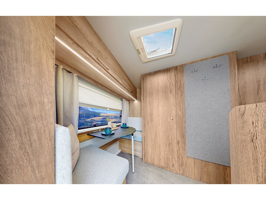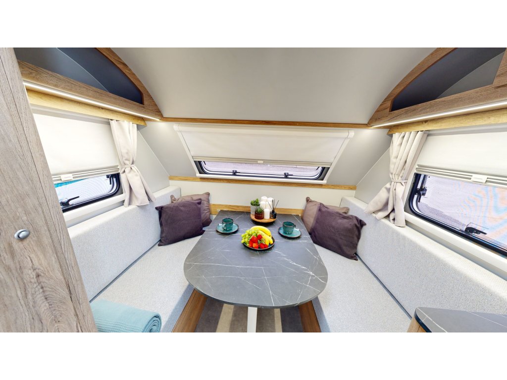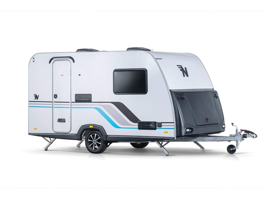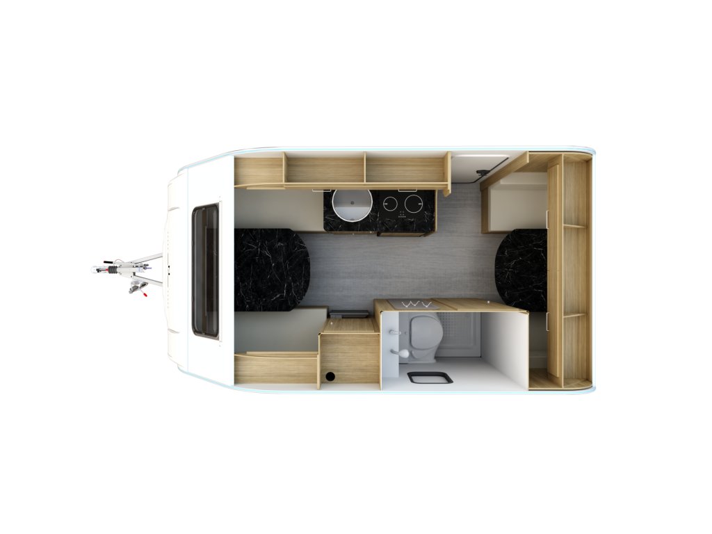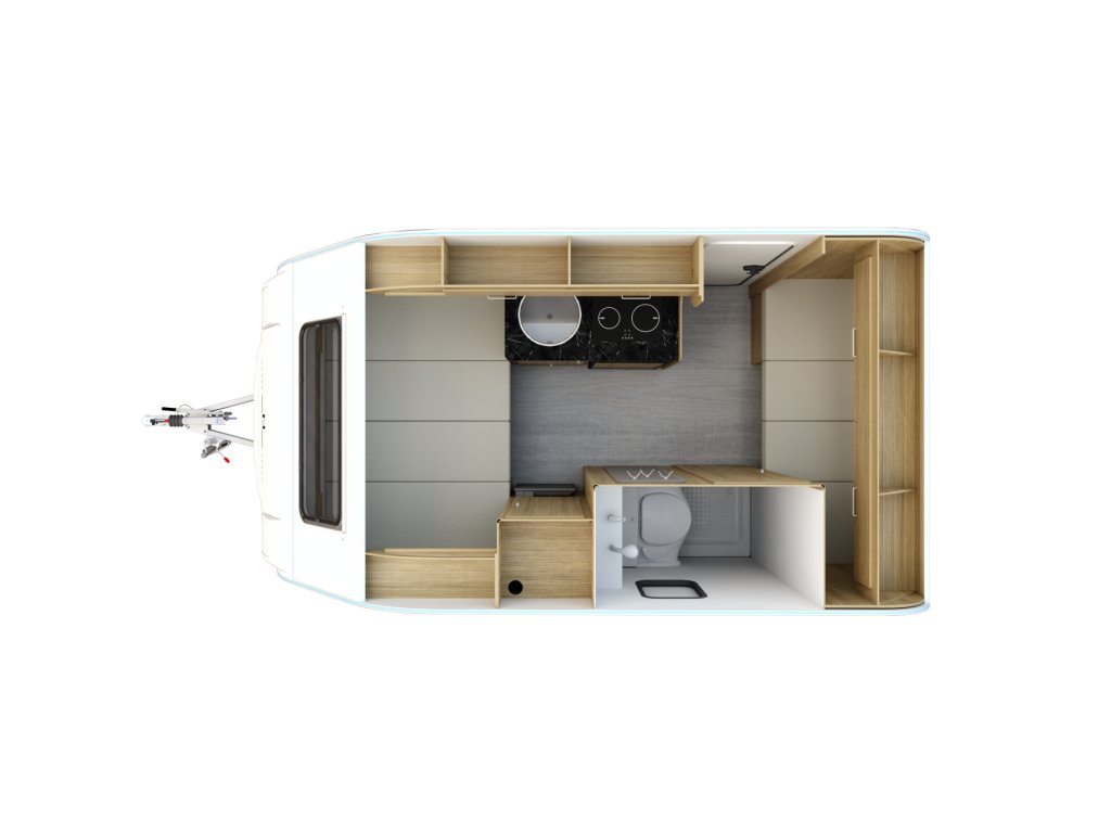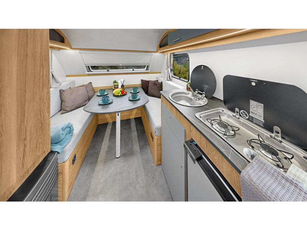 V obývacej izbe je funkčný stôl, ktorý sa dá ľahko premeniť na pohodlnú manželskú posteľ. V zadnej časti je menší stôl, ktorý v prípade potreby môže pôsobiť ako jedno ubytovanie. Pre páry je to vynikajúce riešenie - ponechanie jedného z miest v použiteľnej forme vám dáva ďalší priestor na jedenie alebo prácu bez toho, aby ste museli každý deň zložiť posteľ. Vysoký komfort používania je zabezpečený bohatou štandardnou výbavou. Príves je vybavený kúpeľňou s WC, sprchovacím kútom, elektrickou termálnou vaňou a sprchovacím kútom, ako aj kuchynkou s plynovou kuchyňou, chladničkou a umývadlom – všetko, čo potrebujete pre pohodlné cestovanie a každodenné fungovanie. V najnovších modeloch sme použili moderný, dotykový ovládací panel, ktorý vám umožní intuitívne spravovať všetky hlavné funkcie prívesu. Z jeho úrovne môžete pohodlne ovládať osvetlenie, ovládať hladinu čistej vody v nádrži (30l) alebo skontrolovať stav batérie - to všetko s čistým, moderným rozhraním. Ďalšou výhodou je široká škála ďalších možností vybavenia, vďaka čomu môže každý zákazník prispôsobiť príves svojim individuálnym potrebám a cestovnému štýlu.