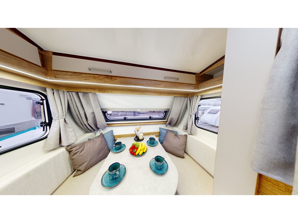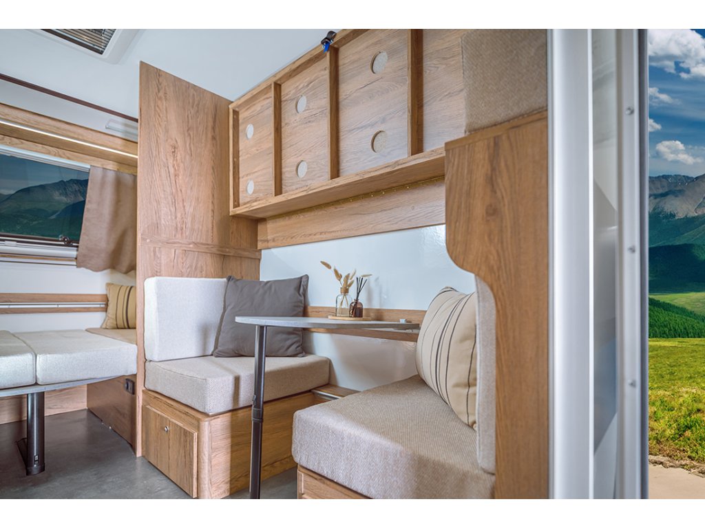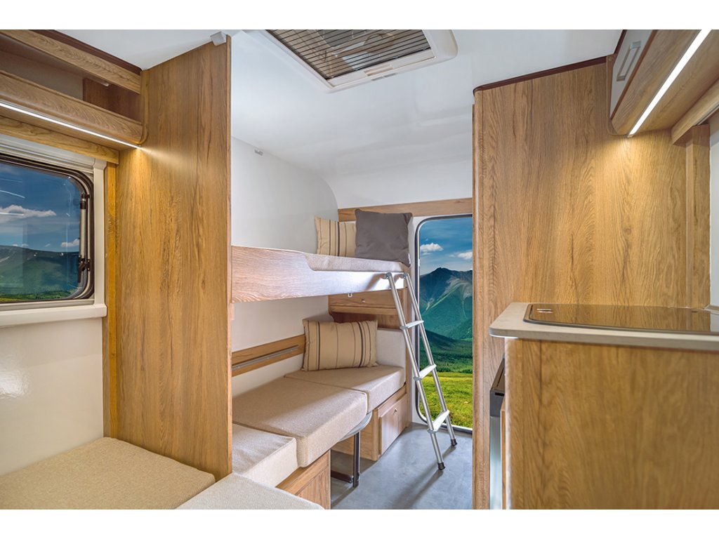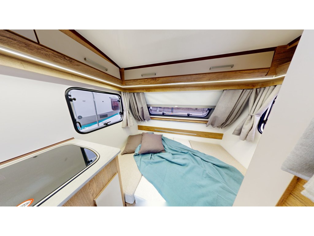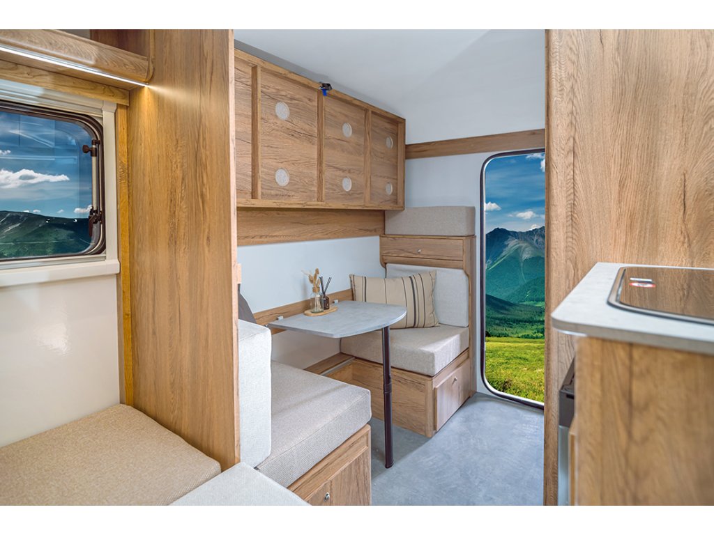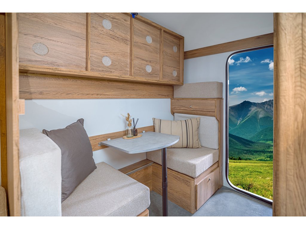 V prednej časti prívesu je pohodlný stôl, ktorý sa dá ľahko premeniť na sklopné lôžko s rozmermi 118 × 190 cm. Na boku je sklopná poschodová posteľ s matracmi 65 × 170 cm, ideálna pre deti (horná časť s maximálnym zaťažením 70 kg).